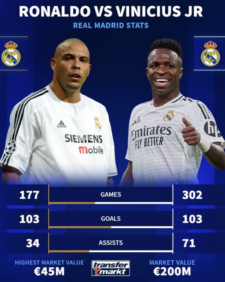 3月13日訊 皇馬在本輪西甲2-1力克巴列卡諾,維尼修斯破門追平大羅的皇馬生涯進球數(shù)?!掇D會市場》也對比了兩人的皇馬生涯關鍵數(shù)據(jù)。羅納爾多為皇馬出戰(zhàn)177場,貢獻103球34助攻,巔峰德轉身價4500萬歐。維尼修斯則在302場為皇馬貢獻103球71助攻,巔峰德轉身價2億歐。 本文標簽: 足球 西甲 皇家馬德里