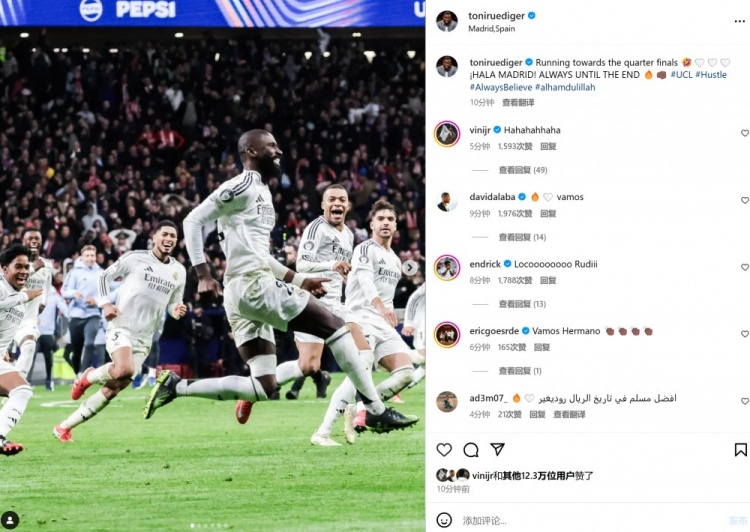 3月13日訊 在本輪歐冠,皇馬點(diǎn)球大戰(zhàn)擊敗馬競晉級。本場比賽呂迪格打進(jìn)致勝點(diǎn)球,賽后他也在個(gè)人社媒曬出全隊(duì)瘋狂慶祝照,配文寫道:“沖向歐冠8強(qiáng),Hala Madrid,永遠(yuǎn)堅(jiān)持到最后一刻!” 本文標(biāo)簽: 足球 西甲 皇家馬德里