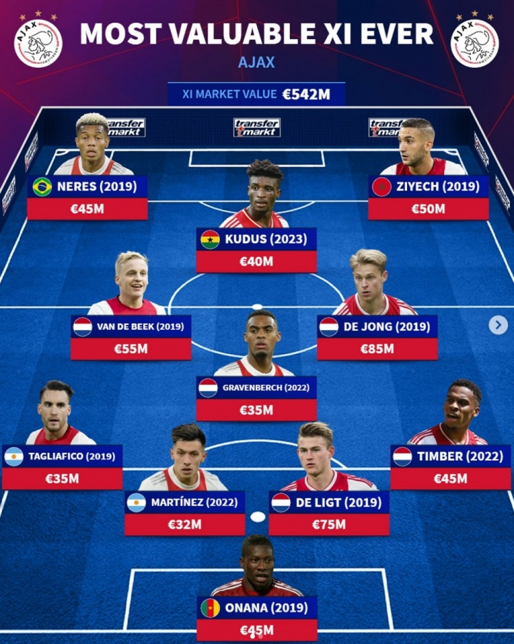 1月31日訊 德轉(zhuǎn)盤點(diǎn)了阿賈克斯隊(duì)史身價(jià)最高11人陣容,其中曼聯(lián)隊(duì)內(nèi)防線三將奧納納、利桑德羅、德里赫特在列,以下為具體陣容(身價(jià)為效力阿賈克斯時(shí)最高身價(jià)):