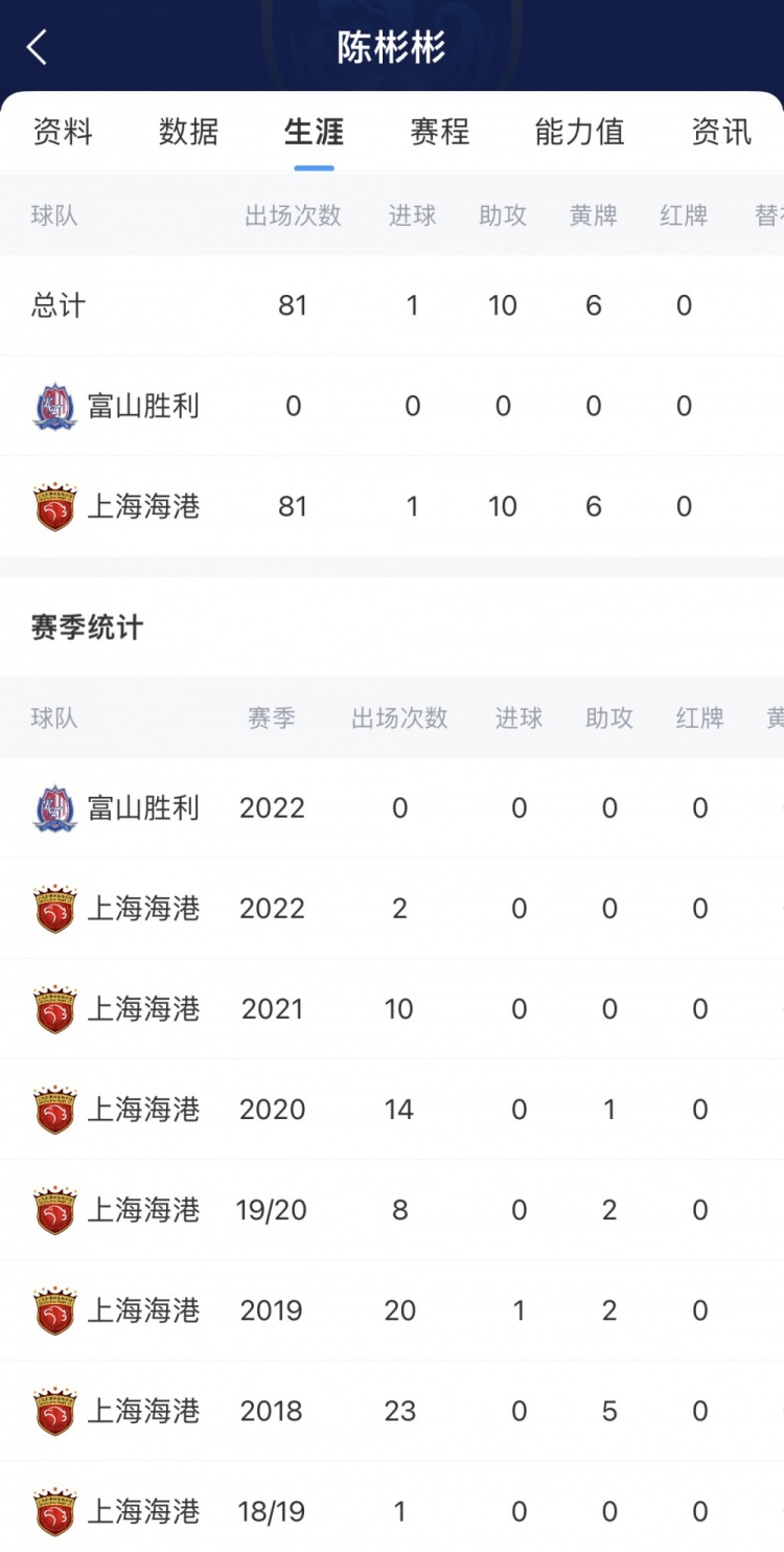 雖然很早就在上海上港一線隊(duì)獲得出場(chǎng)機(jī)會(huì),但陳彬彬近幾年幾乎淡出賽場(chǎng),也有過(guò)因?yàn)閭《毕麄€(gè)賽季的經(jīng)歷。他上一次在國(guó)內(nèi)聯(lián)賽進(jìn)球,發(fā)生在2019賽季中超第18輪上海上港vs河北華夏幸福的比賽中。