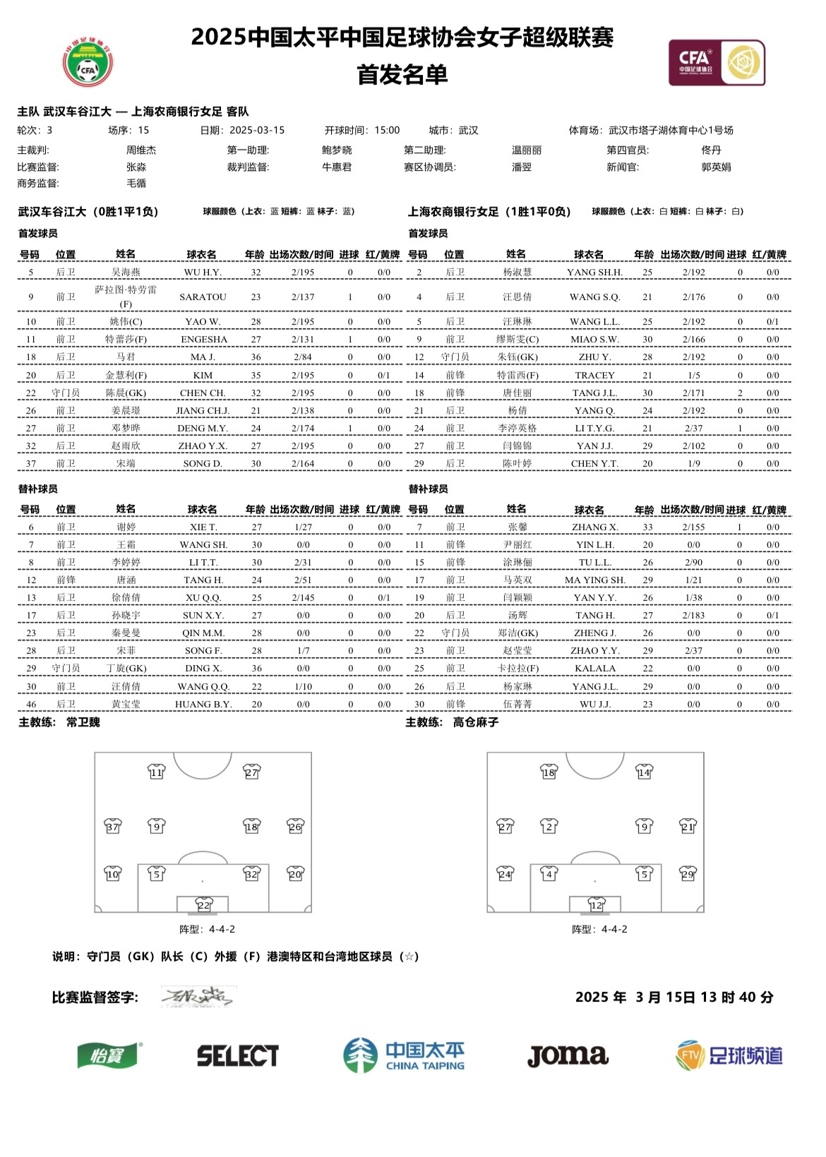 3月15日訊 本周末,女超聯(lián)賽第3輪將繼續(xù)進(jìn)行,武漢車(chē)谷江大將在今天下午15:00主場(chǎng)迎戰(zhàn)上海農(nóng)商銀行。賽前公布的出場(chǎng)名單中,武漢女足的王霜繼續(xù)位列替補(bǔ)。