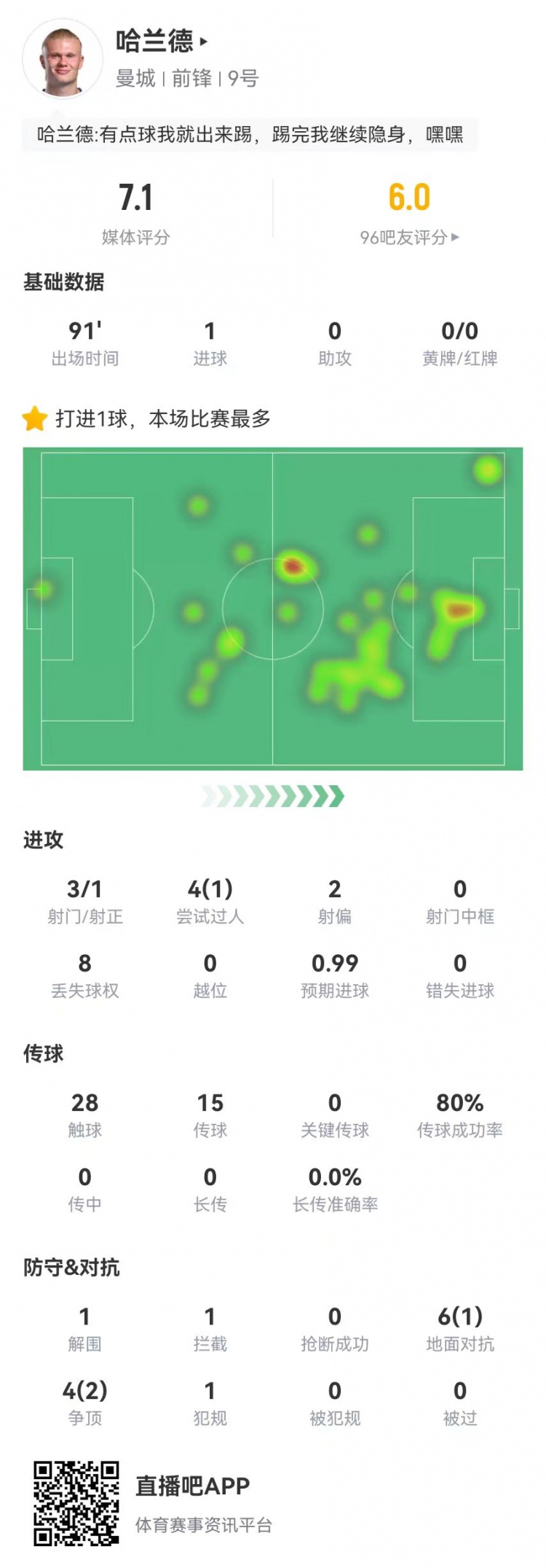 3月16日訊 曼城在本輪英超2-2戰(zhàn)平布萊頓,哈蘭德本場數(shù)據(jù)如下:首發(fā)踢滿全場1球預(yù)期進(jìn)球0.993射門、1射正4過人、1成功28觸球15傳球、12成功,成功率80%10對抗、3成功8丟失球權(quán)1犯規(guī)1解圍1攔截獲評7.1分 本文標(biāo)簽: 足球 英超 曼城 布萊頓 哈蘭德