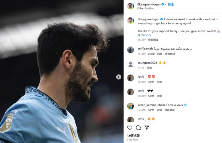 3月16日訊 曼城在本輪英超焦點(diǎn)戰(zhàn)2-2戰(zhàn)平布萊頓,老將京多安在賽后發(fā)文鼓勵(lì)全隊(duì)。