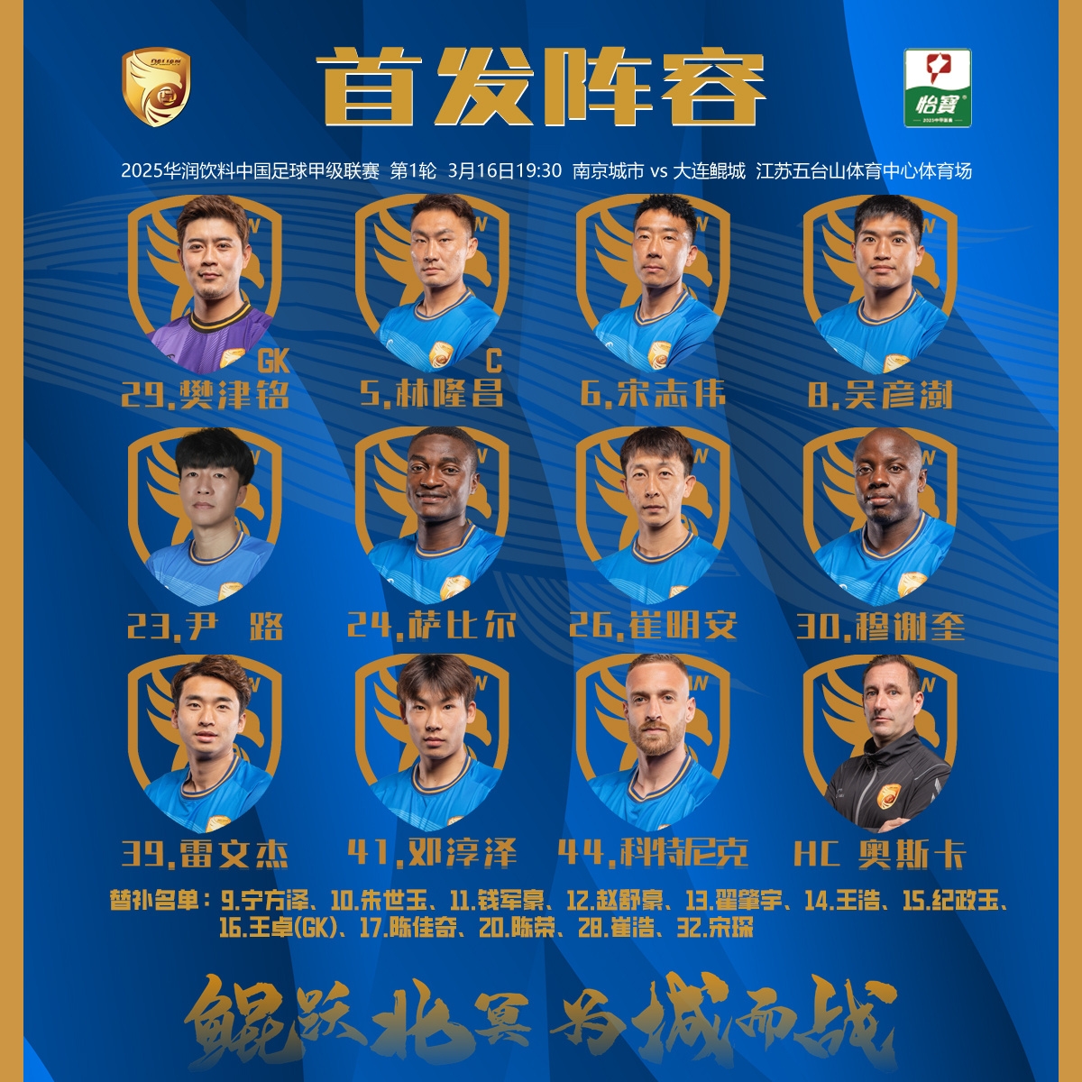 2025賽季中甲聯(lián)賽首輪,大連鯤城客場(chǎng)對(duì)陣南京城市首發(fā)出爐!
