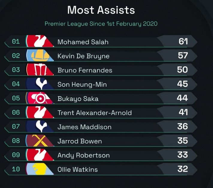 3月17日訊 在本輪英超曼聯3-0大勝萊斯特城的比賽中,B費助攻雙響,個人英超助攻數達到50次。以下為自B費2020年2月英超首秀以來英超同期助攻榜:1、薩拉赫 61次2、德布勞內 57次3、B費 50次4、孫興慜 45次5、薩卡 44次6、阿諾德 41次7、麥迪遜 36次8、鮑文 35次9、羅伯遜 33次10、沃特金斯 32次 本文標簽: 足球 英超 曼聯