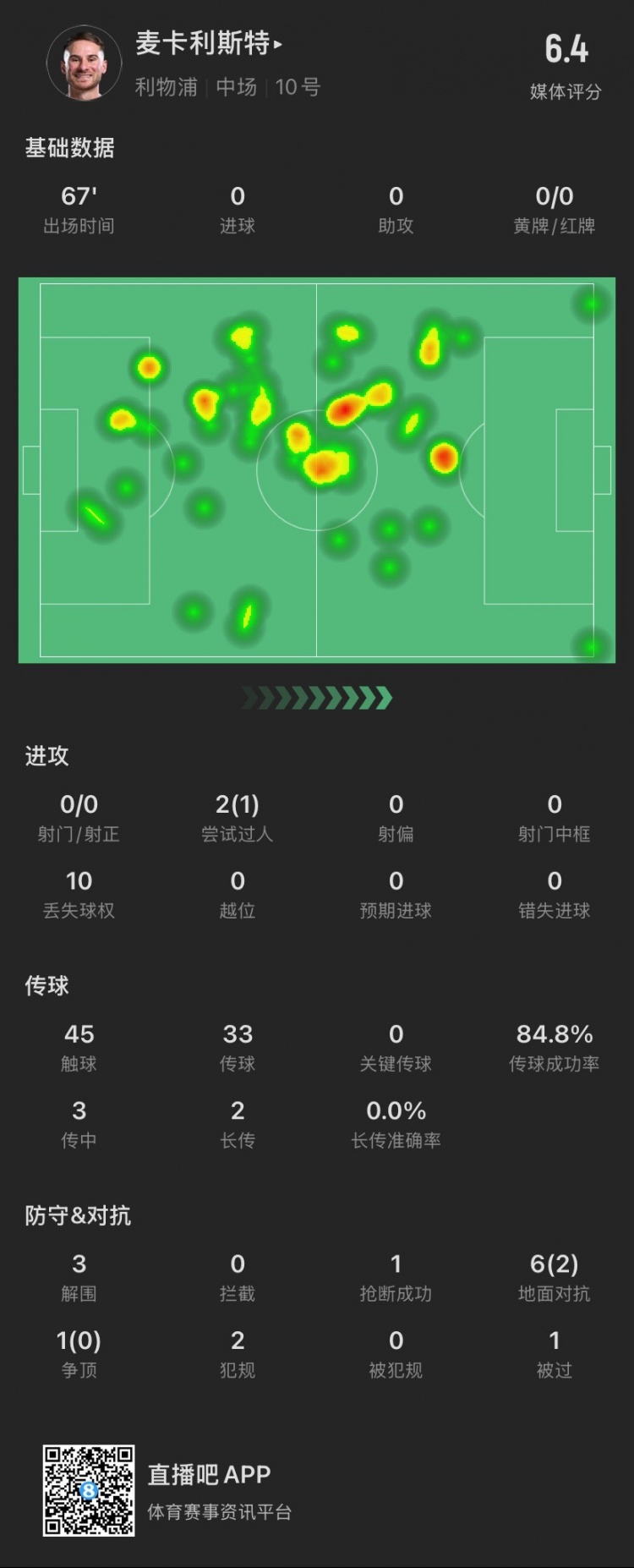 3月17日訊 本賽季聯賽杯決賽,利物浦對陣紐卡的比賽正在進行。麥卡利斯特在第64分鐘被換下場,目前只獲評6.4分。麥卡利斯特對紐卡主要數據↓射門:0過人:嘗試2次,成功1次觸球:45丟失球權:10傳球:33傳球成功率:84.8%傳中:3長傳:2(成功率0%)解圍:3搶斷:1地面對抗:參與6次,成功2次空中對抗:參與1次,沒有成功犯規(guī):2被過:1 本文標簽: 足球 英超 利物浦 紐卡斯爾聯