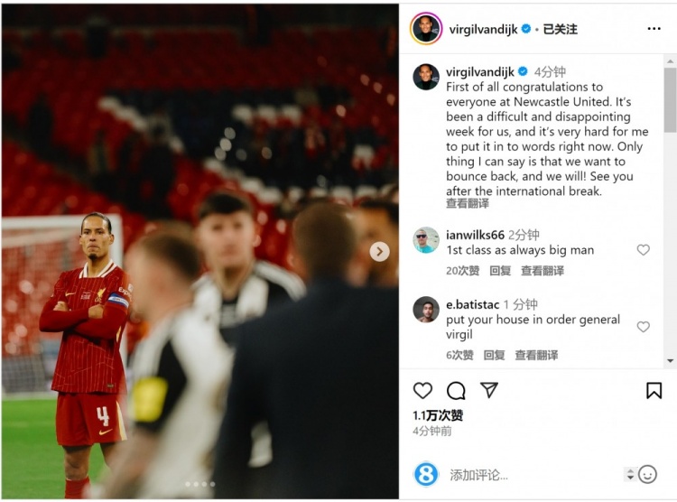 3月17日訊 聯賽杯決賽,利物浦1-2不敵紐卡,無緣冠軍。利物浦隊長范迪克社媒曬出自己賽后失落的照片,并寫道:“首先祝賀紐卡的每個人。對我們來說,這是艱難而令人失望的一周,現在我很難用言語來表達感受。我唯一能說的是,我們希望重新振作,我們會的!國際比賽日后再見?!?/p> 本文標簽: 足球 英超 利物浦 范迪克