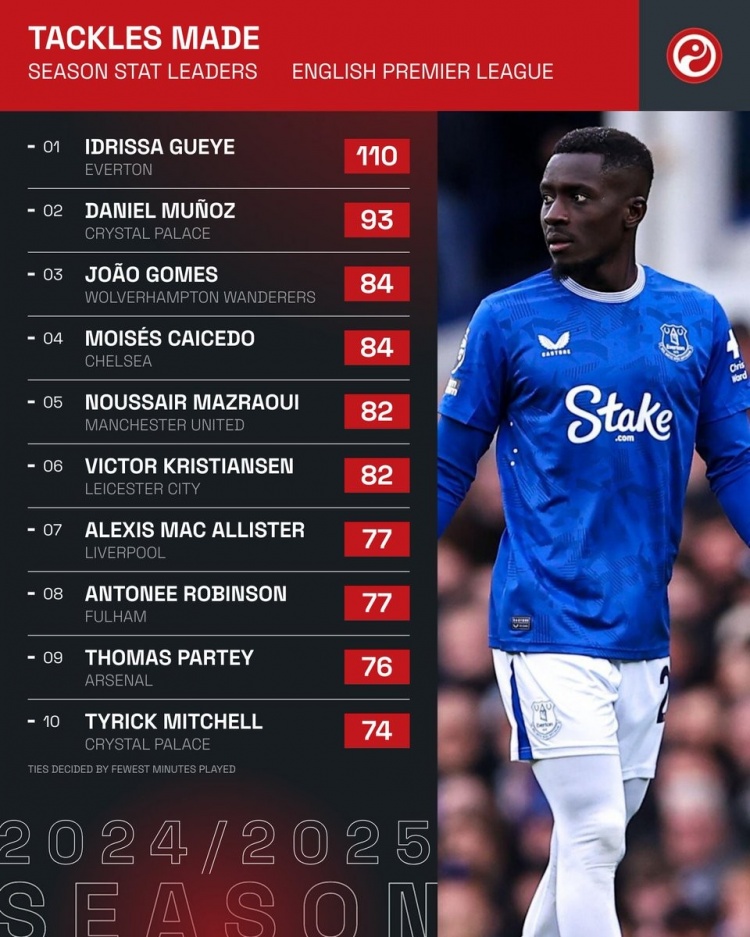 3月18日訊 國家隊比賽周到來,英超也暫時告一段落,squakwa統(tǒng)計了本賽季英超成功搶斷情況,蓋耶獨(dú)自領(lǐng)跑。