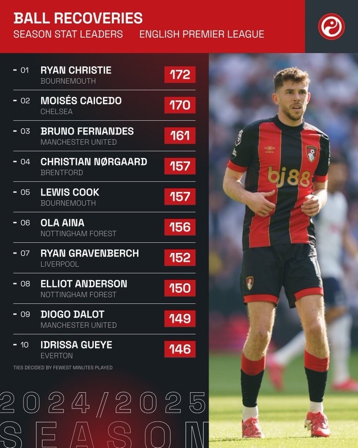3月18日訊 國家隊比賽周到來,英超也暫時告一段落,squakwa統(tǒng)計了本賽季英超贏得球權情況,克里斯蒂居首。