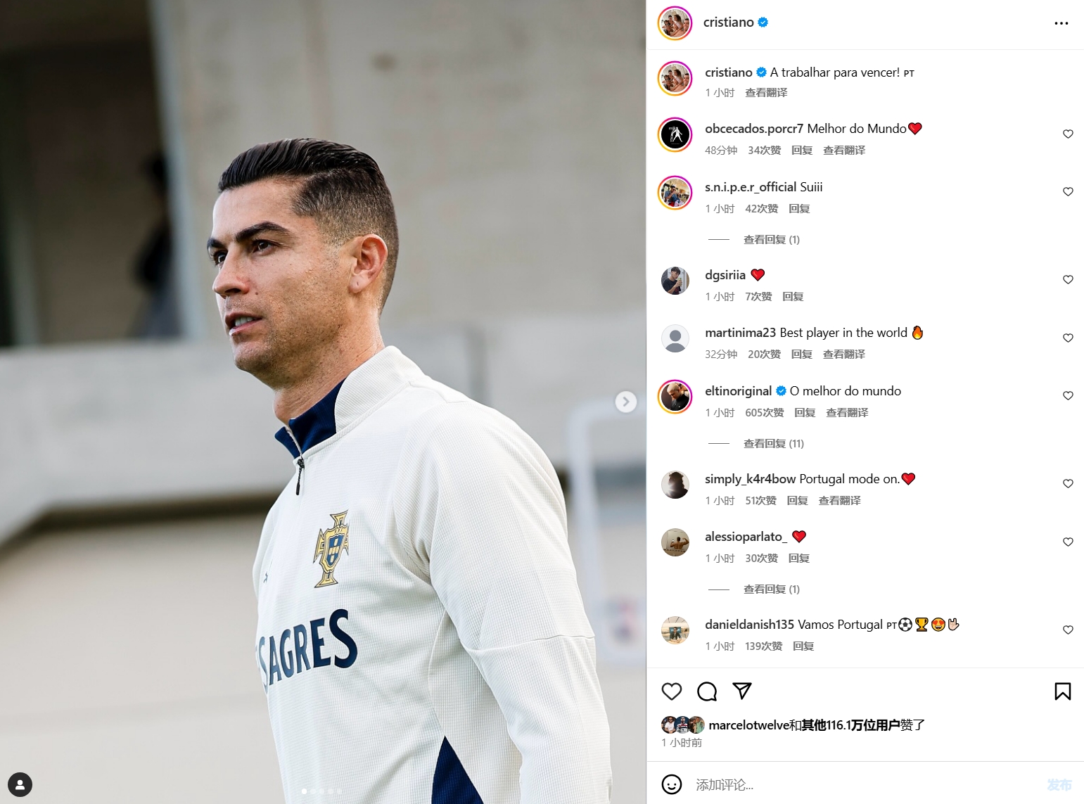 3月19日訊 不久前,正在葡萄牙國家隊備戰(zhàn)的C羅更新了社交媒體。C羅曬出了自己的訓(xùn)練照,配文寫道:“為了勝利而工作!”本期國家隊比賽日,葡萄牙將會迎來歐國聯(lián)1/決賽,將在在3月21日和3月24日的客場和主場對陣丹麥隊。 本文標(biāo)簽: 足球 利雅得勝利 國家隊 葡萄牙 C羅