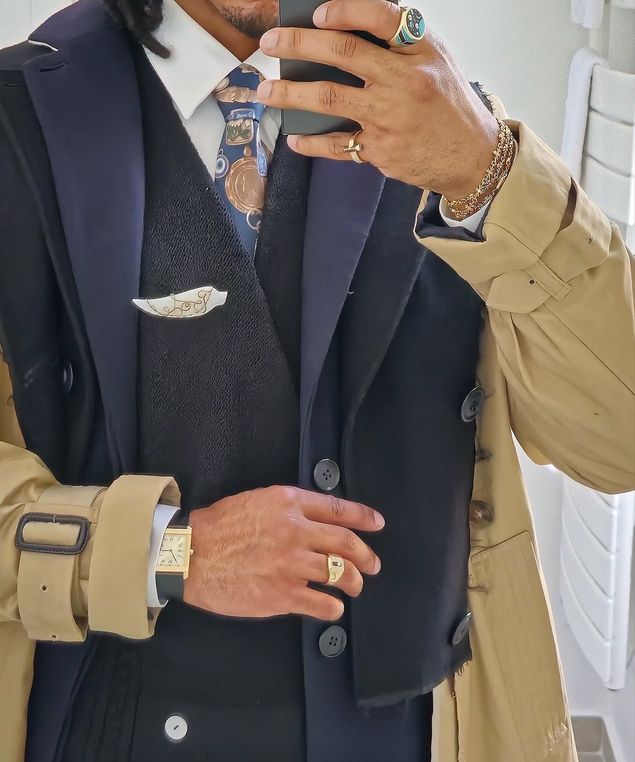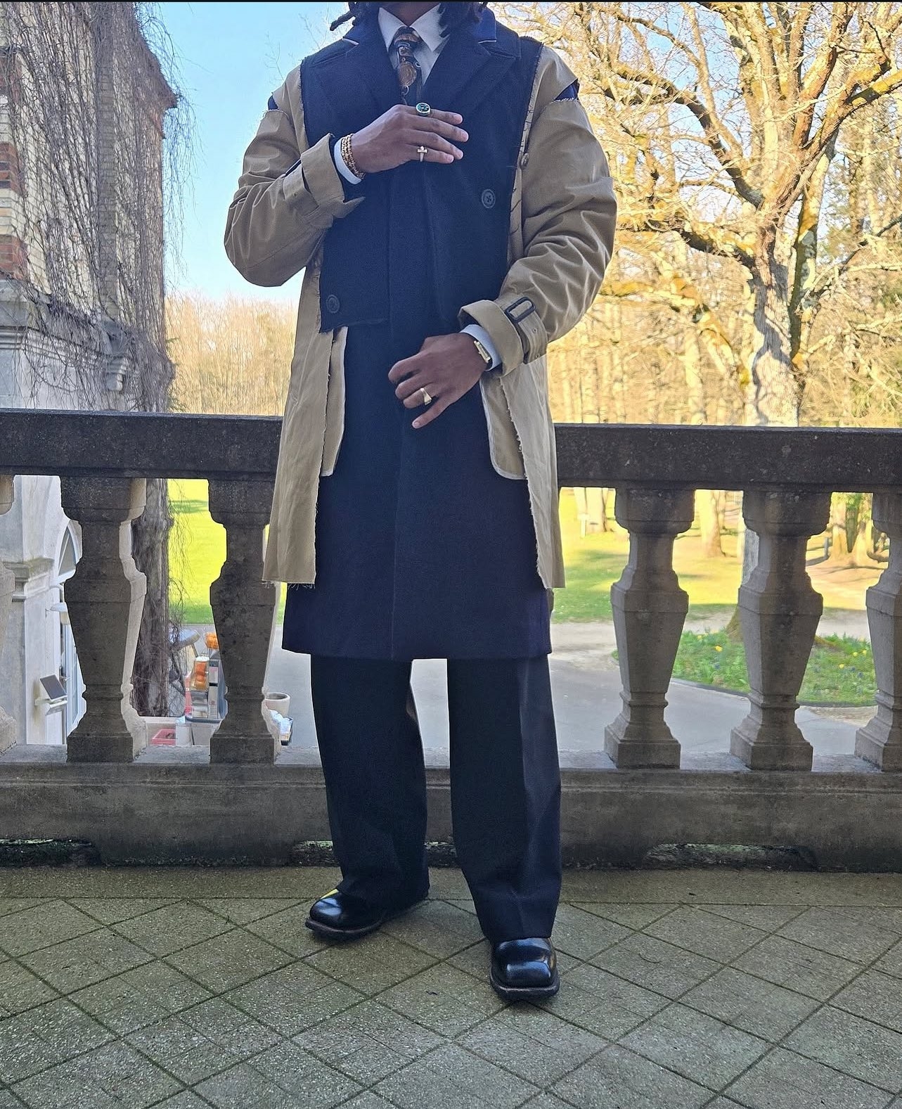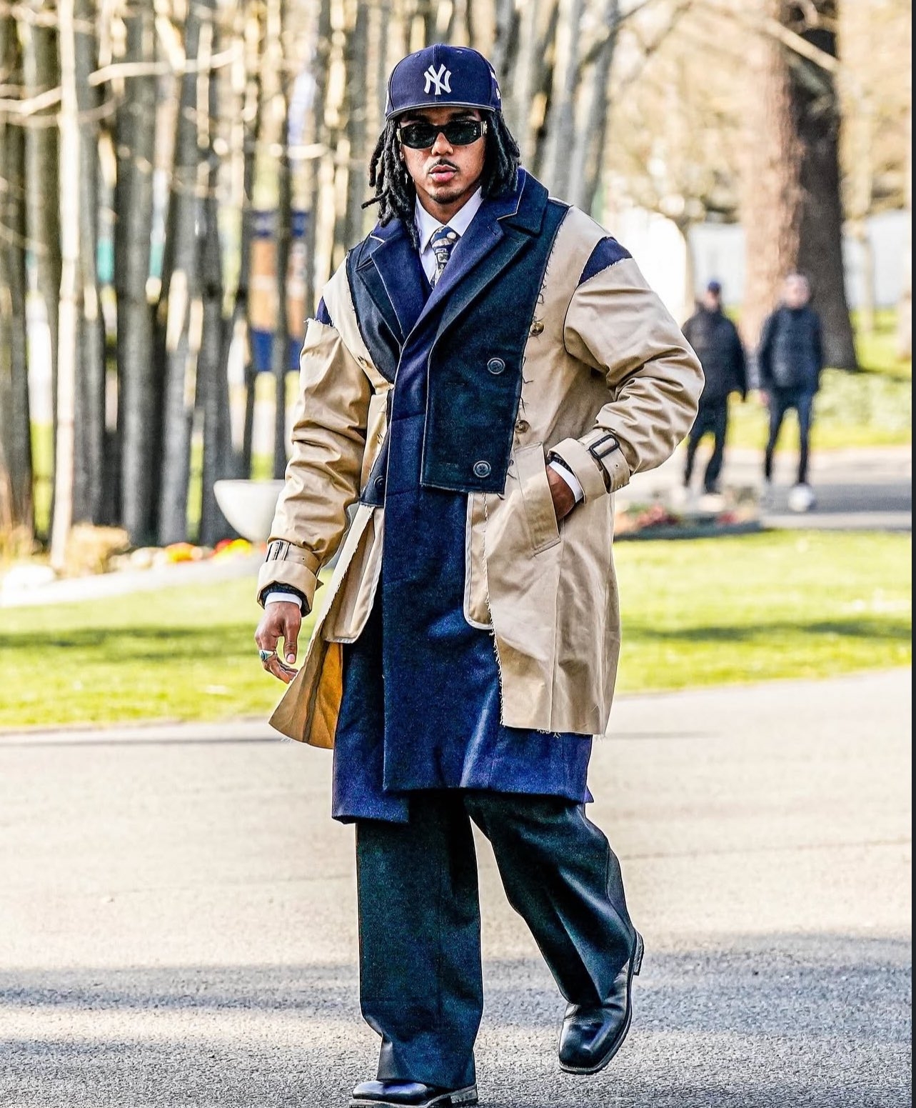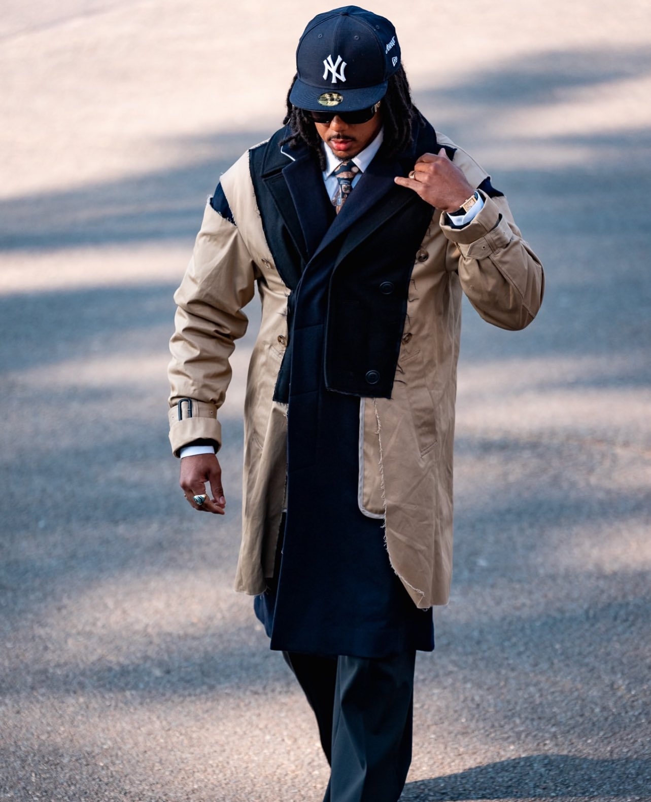 這一次孔德的穿搭中,最引人注目的就是他身上的拼接外套,這件大衣來自日本小眾設(shè)計師品牌FACETASM,是2022-23的秋冬系列中的一件。