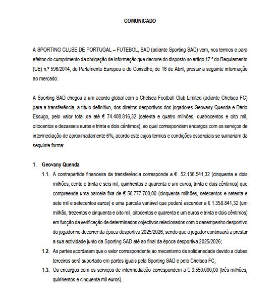 03月20日訊 葡萄牙體育官方消息,昆達(dá)、埃蘇戈將加盟切爾西,兩人轉(zhuǎn)會費共計7400萬歐。