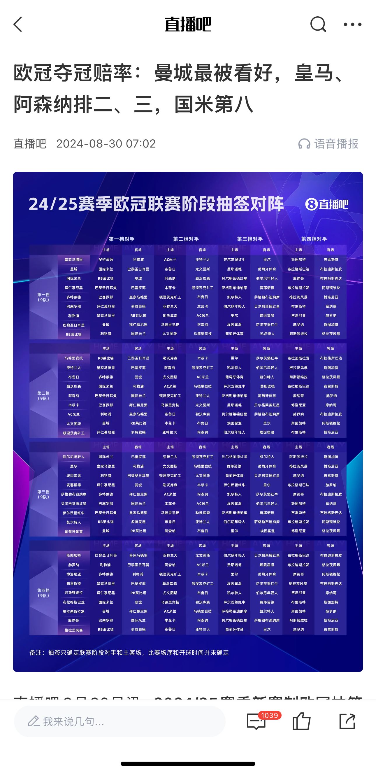 本賽季歐冠開賽前,聯(lián)賽階段抽簽結(jié)束后,曼城和皇馬分列奪冠賠率前二。但是兩大熱門在聯(lián)賽階段未獲直通名額,如今在附加賽相遇,只有一隊(duì)能進(jìn)入歐冠16強(qiáng)。