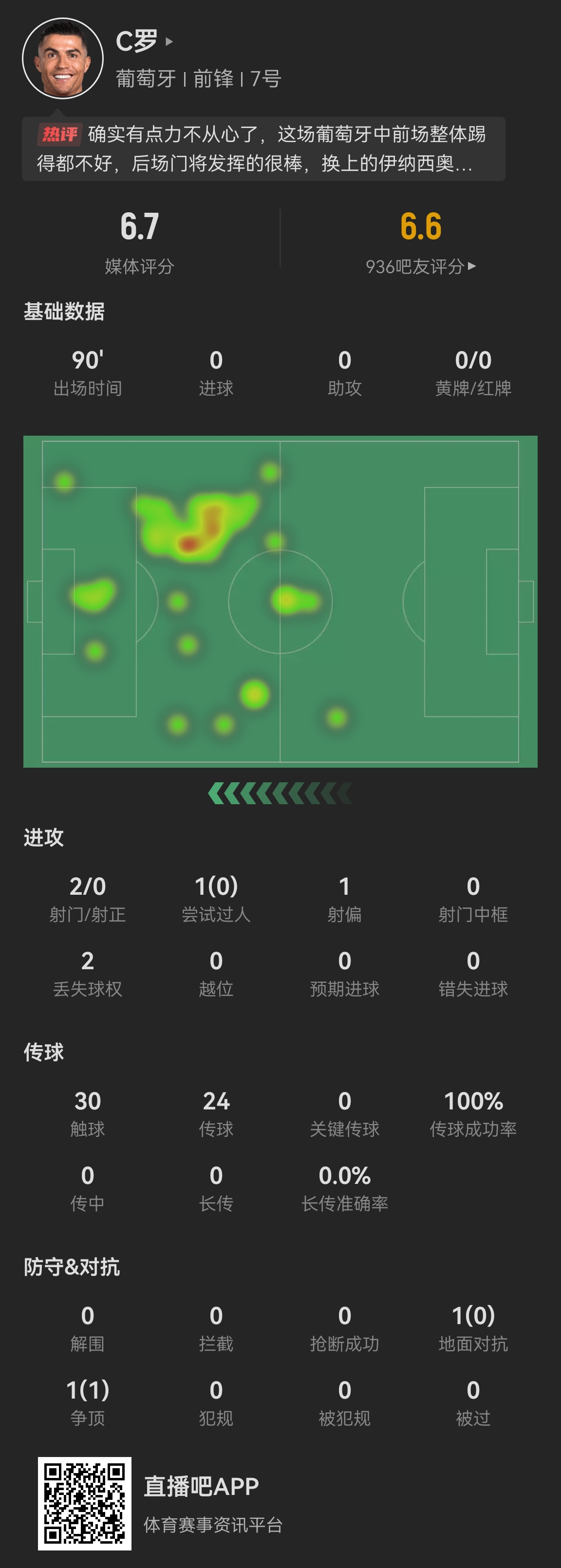 03月21日訊 歐國聯(lián)1/4決賽首回合,葡萄牙客場0-1不敵丹麥。40歲的C羅首發(fā)出場,打滿了全場,觸球30次,獲評6.7分,這兩項(xiàng)數(shù)據(jù)均為葡萄牙首發(fā)球員最低。 本文標(biāo)簽: 足球 C羅 葡萄牙 丹麥