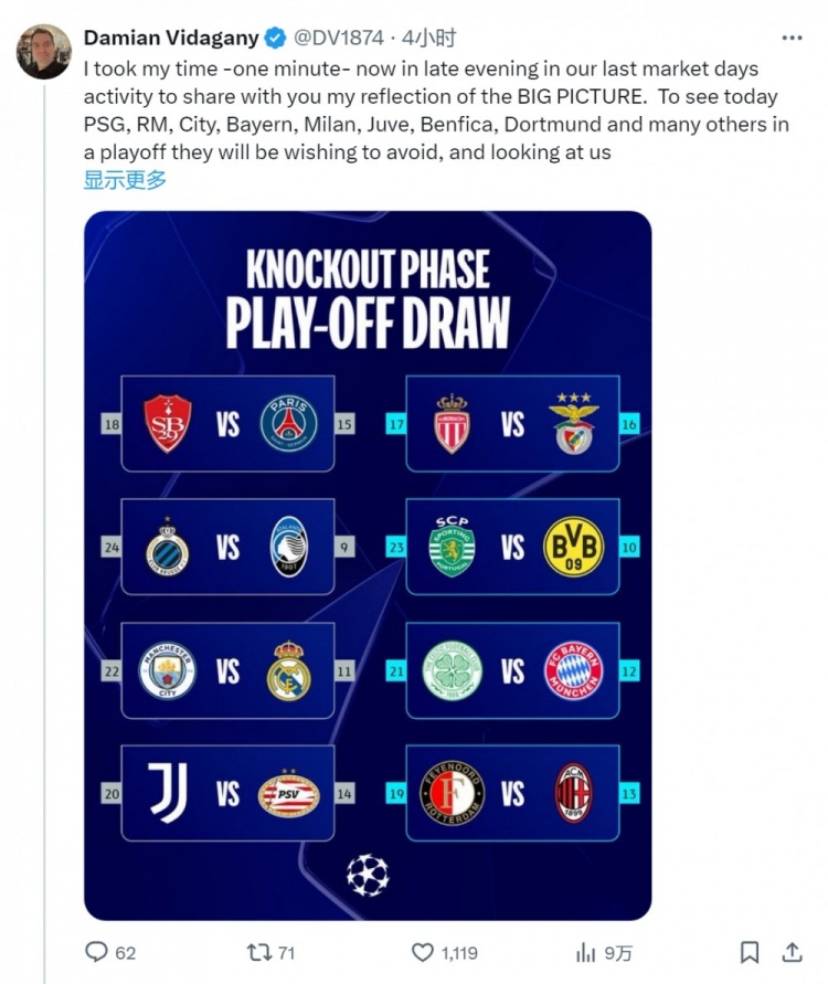 維達(dá)加尼曬出歐冠附加賽的對陣表,并寫道:“在冬窗尾聲階段的晚上,我花一分鐘的時間與大家分享我對整體情況的看法??吹桨屠琛⒒蜀R、曼城、拜仁、米蘭、尤文、本菲卡、多特和許多其他球隊都得參加原本想要避免的附加賽,而我們最終卻取得了更好的成績,這讓我為埃梅里、球員、蒙奇、老板和所有幕后人員的辛勤工作感到驕傲?!?/p>