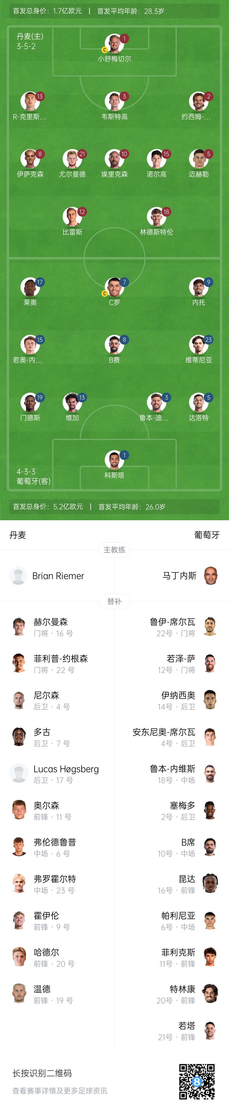 3月21日訊 北京時(shí)間03:45,歐國(guó)聯(lián)1/4賽決賽首回合,葡萄牙客場(chǎng)挑戰(zhàn)丹麥。賽前官方公布了雙方的首發(fā)名單。
