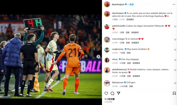 他也在賽后通過(guò)社媒曬出自己的替補(bǔ)登場(chǎng)照,并配文:“為國(guó)家隊(duì)完成首秀就是夢(mèng)想成真。我們周日再見,西班牙!”