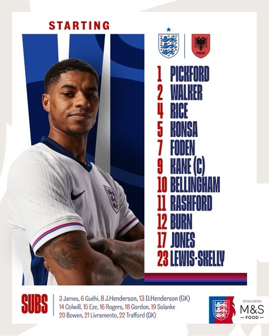英格蘭首發(fā):1-皮克福德、2-沃克、5-孔薩、12-丹-伯恩、23-斯凱利、4-賴斯、17-柯蒂斯-瓊斯、7-福登、10-貝林厄姆、11-拉什福德、9-凱恩