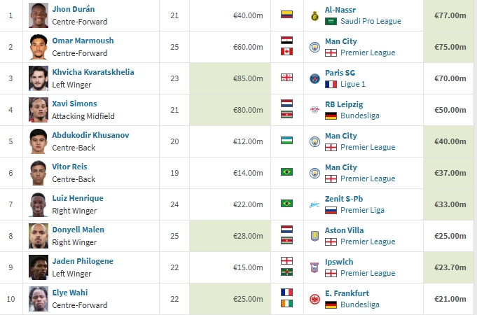 利雅得勝利官宣簽下杜蘭,杜蘭也以7700萬(wàn)歐暫時(shí)成為今年冬窗標(biāo)王,前十曼城有3人入選。