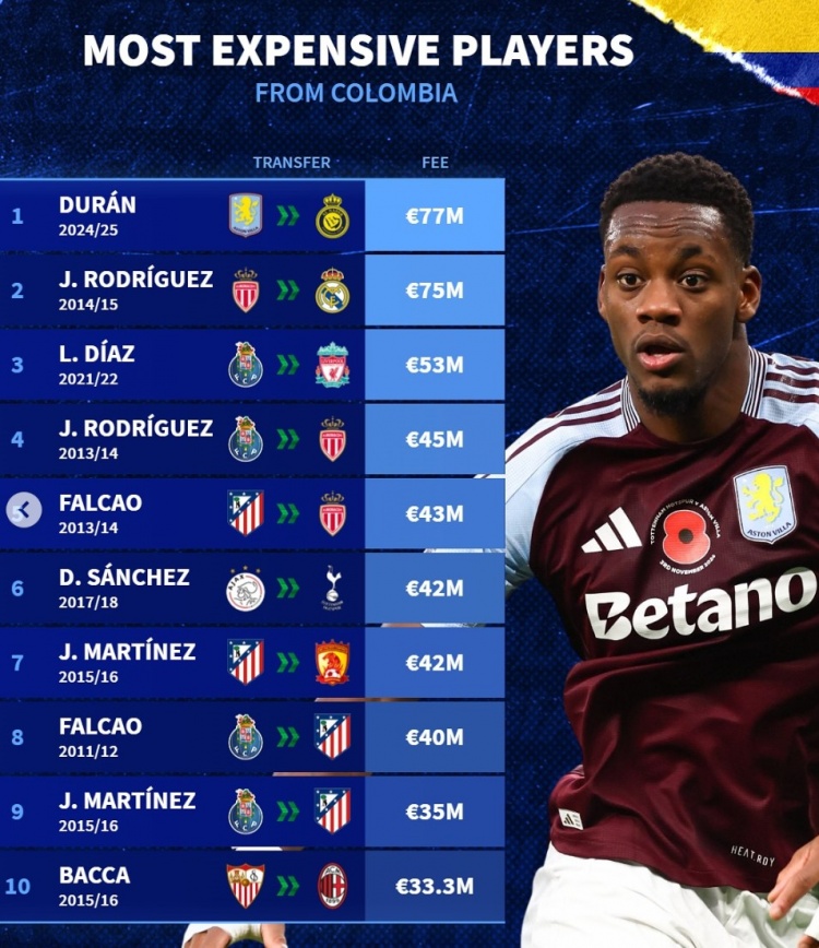 2月1日訊 利雅得勝利已經(jīng)官宣7700萬(wàn)歐基礎(chǔ)轉(zhuǎn)會(huì)費(fèi)簽下維拉前鋒杜蘭,數(shù)據(jù)統(tǒng)計(jì)顯示這也打破了哥倫比亞籍球員的歷史轉(zhuǎn)會(huì)費(fèi)紀(jì)錄。