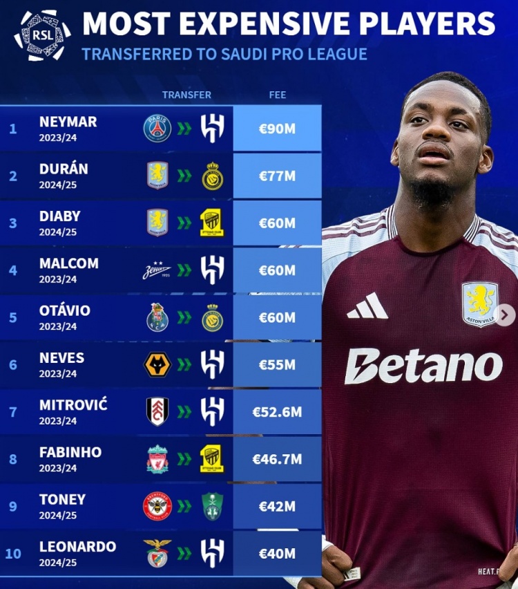 2.杜蘭,維拉→利雅得勝利,24-25賽季,7700萬