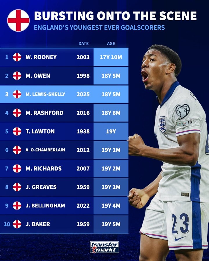 3月22日訊 今天凌晨,英格蘭2-0擊敗阿爾巴尼亞,斯凱利首秀破門,德國轉(zhuǎn)會市場統(tǒng)計(jì),斯凱利是英格蘭隊(duì)史第三年輕的進(jìn)球者。
