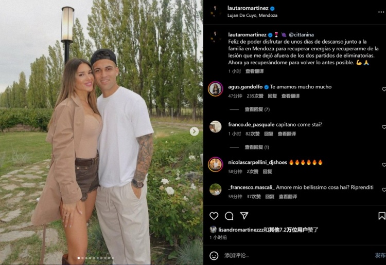 勞塔羅曬出和家人度假的照片,并寫道:我很開心能夠和家人在門多薩休息幾天,從而補(bǔ)充能量。我因傷缺席了兩場世界杯預(yù)選賽,希望能從傷病中恢復(fù)過來。 現(xiàn)在我正在康復(fù)當(dāng)中,以便盡快復(fù)出。