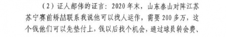 2020年末,山東泰山對陣江蘇蘇寧賽前矯喆聯(lián)系我說他可以找人運(yùn)作,需要200多萬,這個錢他們可以先墊付上,錢以后找個機(jī)會,通過球員轉(zhuǎn)會費(fèi)、簽字費(fèi)把錢賺回來,我同意了,矯喆就去做江蘇球員“工作”,加上我這邊讓球員全力以赴去踢,最終這場比賽的比分是山東泰山隊(duì)2-0江蘇蘇寧,我們(足協(xié)杯)奪冠了。矯喆和我說他們運(yùn)作這場球花了200萬,這個錢是矯喆他們出的。我沒有主動還過這個錢,但是我把矯喆招到我們隊(duì)當(dāng)助理教練了,給他找了個工作,也算是還他幫我的運(yùn)作這場比賽的人情了。