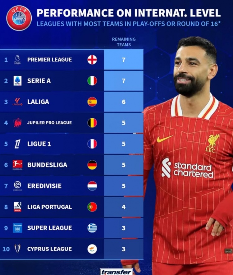 2月1日訊 本賽季歐戰(zhàn)小組賽已經(jīng)完賽,《轉(zhuǎn)會市場》也統(tǒng)計(jì)了各大聯(lián)賽在歐戰(zhàn)淘汰賽階段的席位: