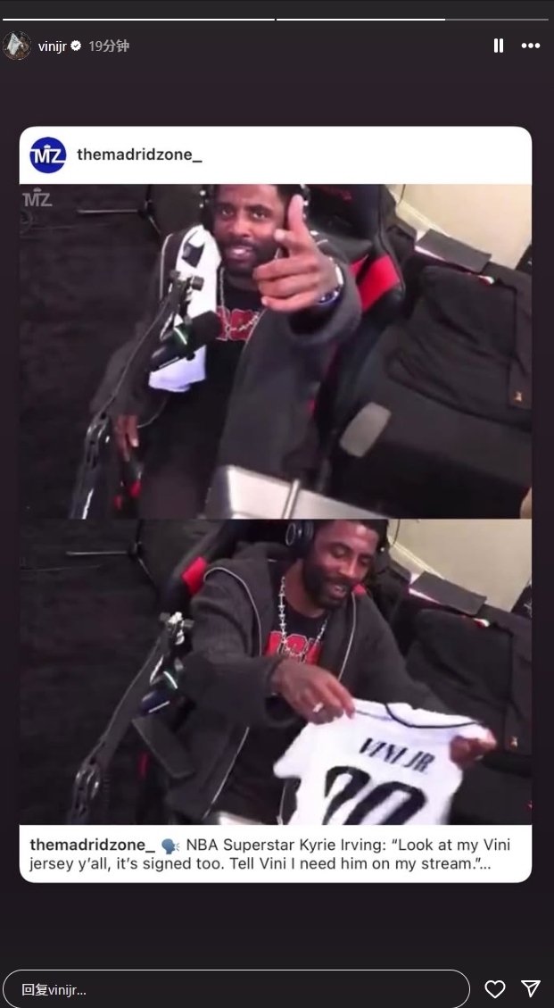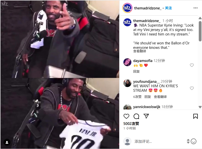 維尼修斯社媒截圖03月24日訊 NBA球星凱里歐文近日開啟直播,期間他為維尼修斯發(fā)聲。歐文曬出了維尼修斯的簽名球衣,表示:“你們看看我的維尼修斯球衣,這是簽了名的。告訴他我需要它出現(xiàn)在直播里。他本該獲得金球獎(jiǎng),每個(gè)人都清楚?!?/p>維尼修斯轉(zhuǎn)載原帖截圖 本文標(biāo)簽: 足球 西甲 皇家馬德里