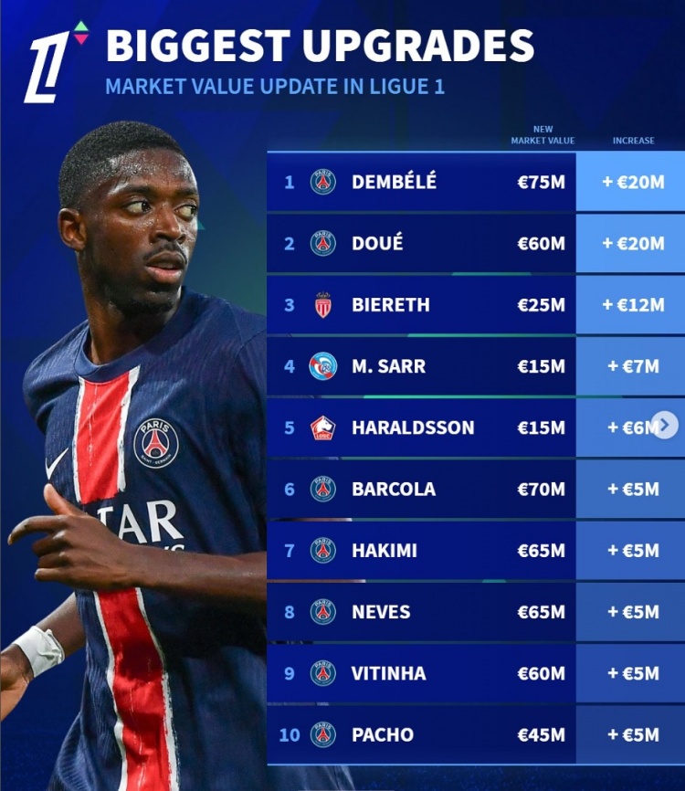 3月25日訊 《轉會市場》已經(jīng)更新了法甲球員身價,并列出了升值最多榜單,巴黎7將在列。