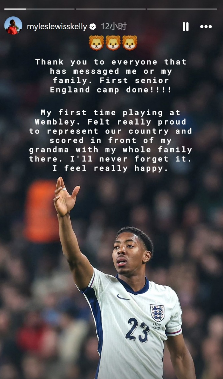 斯凱利寫道:“感謝所有為我和我的家人送上問候的人,首次英格蘭一線隊(duì)之旅結(jié)束了?。?!這是我第一次在溫布利球場踢球。能為國出戰(zhàn),并在奶奶和全家面前進(jìn)球,我倍感驕傲。我永遠(yuǎn)不會忘記,也感到非常開心?!?/p>