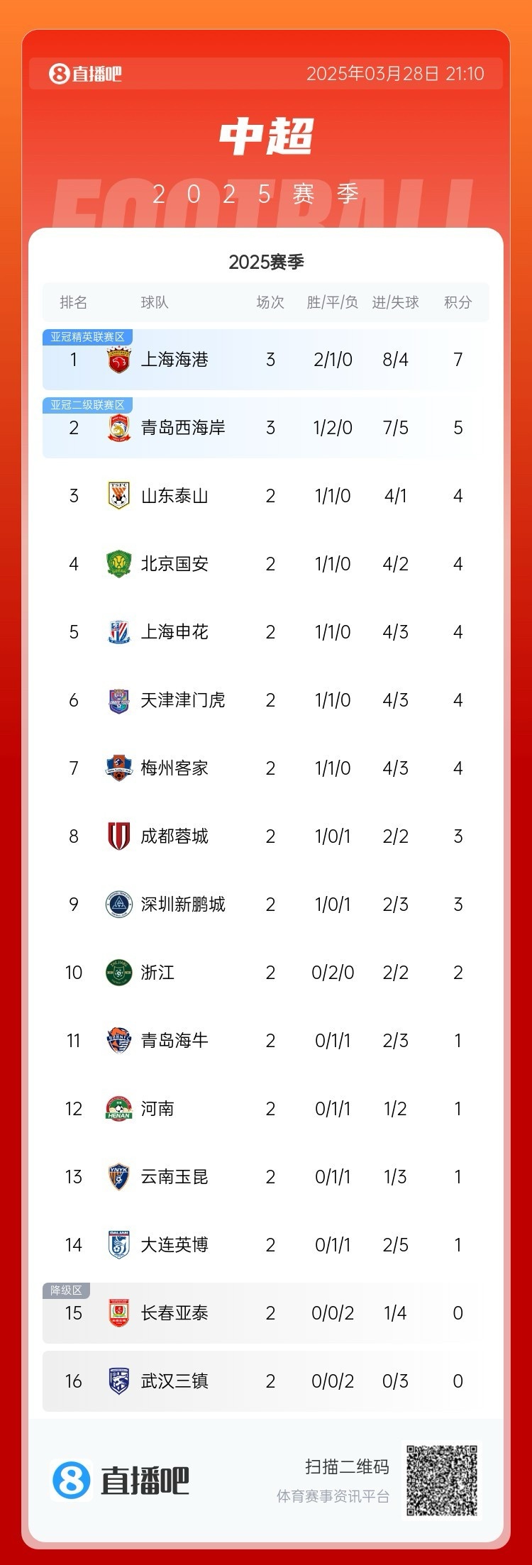 新賽季中超前2輪后,僅有衛(wèi)冕冠軍上海海港保持全勝,他們主場(chǎng)分別3-1擊敗深圳新鵬城、2-0擊敗長(zhǎng)春亞泰。