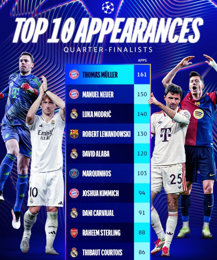 3月28日訊 本賽季歐冠8強(qiáng)已經(jīng)全部誕生,分別為阿森納、皇馬、巴黎圣日耳曼、維拉、巴薩、多特、拜仁以及國(guó)米。歐足聯(lián)官方統(tǒng)計(jì)了8強(qiáng)中出戰(zhàn)歐冠比賽場(chǎng)次最多的球員top10,穆勒以161場(chǎng)居首,諾伊爾150場(chǎng)位居次席。