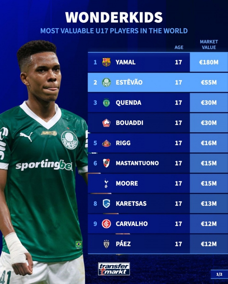 3月29日訊 《轉會市場》完成了球員身價更新,并列出了U17球員身價榜,亞馬爾無懸念斷崖領跑,多位球員已經(jīng)被切爾西預訂。