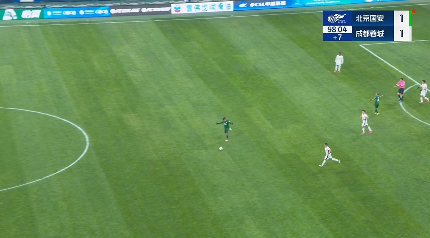 成都最后禁區(qū)外射門和彈子球一樣亂彈了幾下,先是彈到了馬寧腿上,然后又彈向國安進(jìn)攻方面,張玉寧得到球……