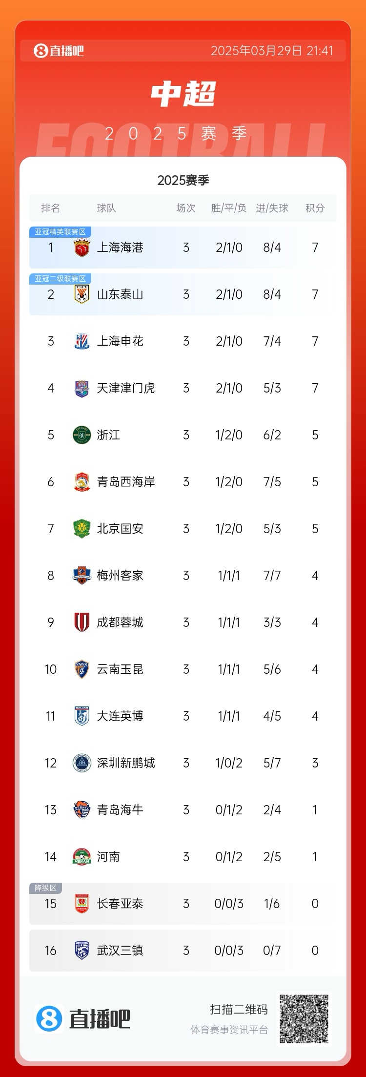 03月29日訊 中超第三輪已全部結(jié)束,本輪中超8場比賽共打入了33粒進球,場均超過4球。其中,僅有三場比賽少于3個進球。另有三場比賽至少產(chǎn)生6個進球。本輪賽果↓積分榜↓ 本文標簽: 足球 中超 中國足球 武漢三鎮(zhèn) 天津津門虎 青島西海岸 大連英博 梅州客家 山東泰山 浙江 上海申花 云南玉昆 長春亞泰 上海海港 成都蓉城 青島海牛 深圳新鵬城 北京國安 河南