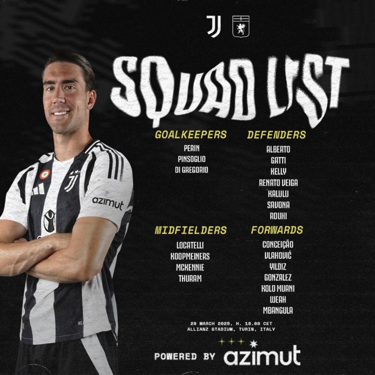 3月29日訊 北京時間明天凌晨1點,尤文將在意甲第30輪比賽中主場對陣熱那亞,這將是尤文新帥圖多爾的首秀,尤文公布了此役的球員名單,弗拉霍維奇、小孔塞桑在列,坎比亞索、道格拉斯-路易斯缺席。