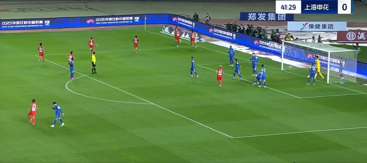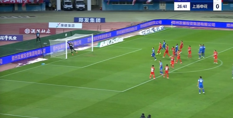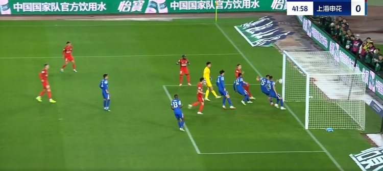 第27分鐘,申花前場左側(cè)定位球機(jī)會(huì),高天意主罰,皮球直奔十分角,最終擊中門框彈出底線↓