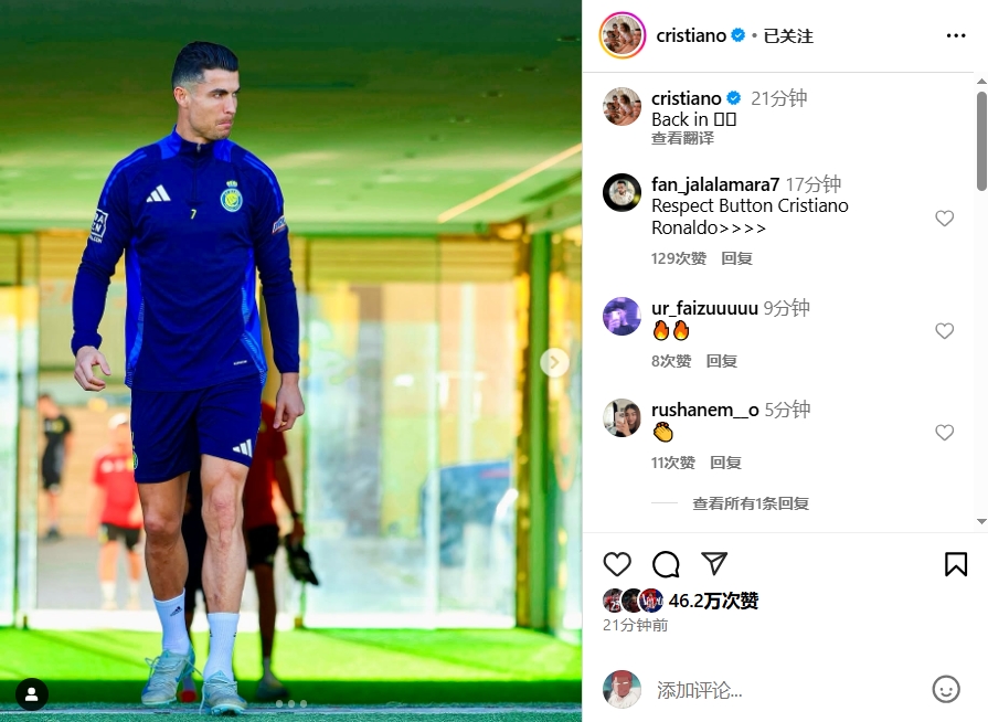 3月30日訊 今日C羅更新社媒,曬出自己身穿利雅得勝利訓練服的照片,并配文Back in。國家隊比賽日之后,利雅得勝利的首場比賽將于北京時間4月5日進行,對手將是利雅得新月。 本文標簽: 足球 利雅得勝利 利雅得新月 C羅