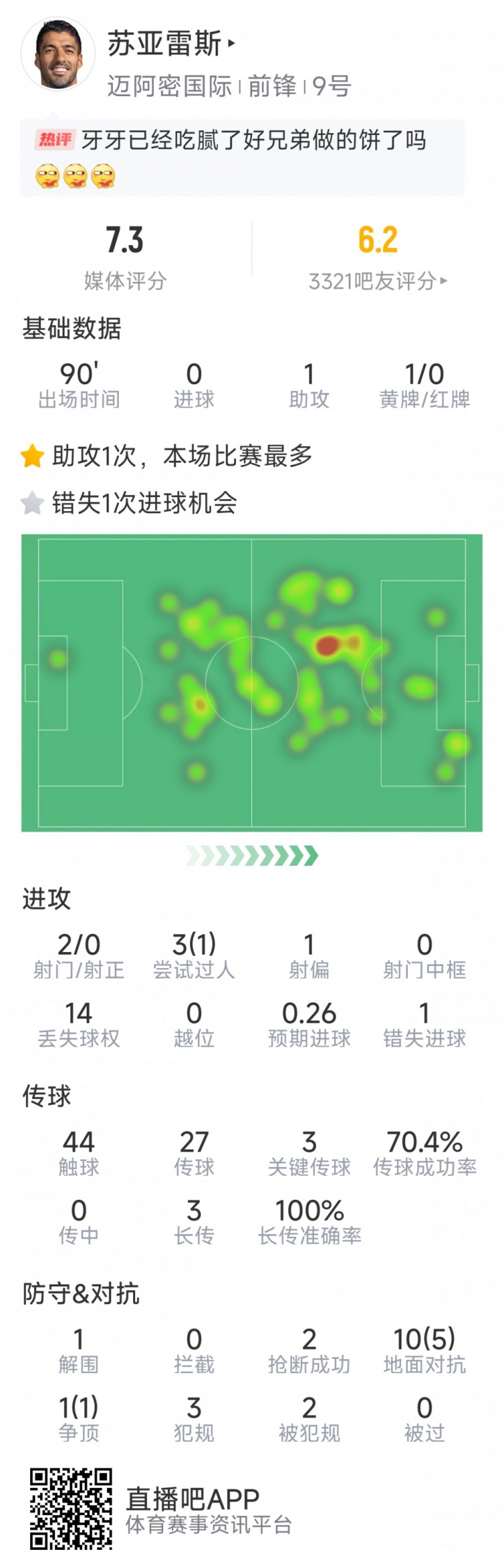 3月30日訊 在北京時間今天上午進(jìn)行的美職聯(lián)比賽中,蘇亞雷斯助攻梅西破門,幫助邁阿密國際主場2-1擊敗費城聯(lián)。邁阿密國際官方宣布,蘇亞雷斯當(dāng)選本場比賽邁阿密隊內(nèi)最佳球員。蘇亞雷斯本賽季至今為邁阿密出戰(zhàn)9場比賽,打進(jìn)4球,助攻6次。蘇亞雷斯本場數(shù)據(jù): 本文標(biāo)簽: 足球 邁阿密國際 MLS