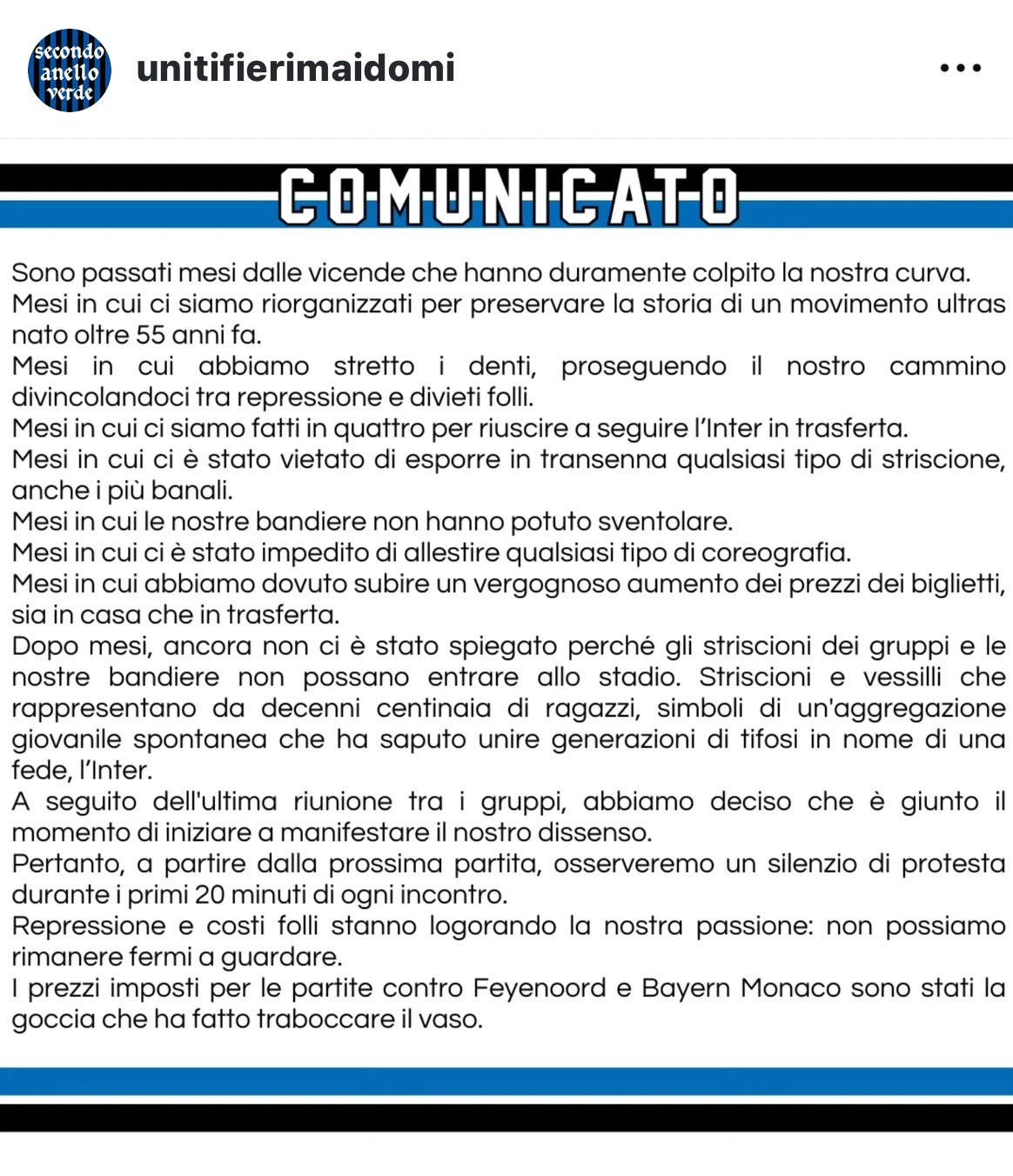 3月30日訊 國(guó)米北看臺(tái)球迷組織發(fā)布公告,宣布在之后每場(chǎng)比賽的前20分鐘保持沉默,抗議票價(jià)過高、主場(chǎng)禁止攜帶標(biāo)語等情況。