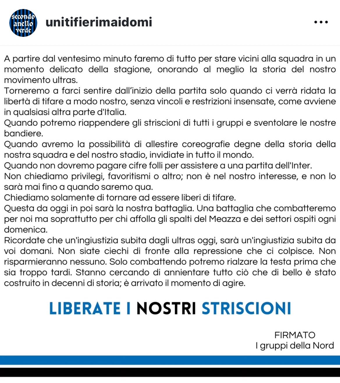 只有當(dāng)我們重新獲得以自己的方式歡呼的自由時(shí),我們才會(huì)重新讓自己的聲音響起。不受毫無意義的約束和限制,就像在意大利的任何其他球場(chǎng)發(fā)生的那樣。