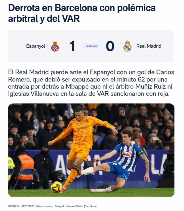 皇馬因?yàn)榭逅?羅梅羅的進(jìn)球輸給了西班牙人,而羅梅羅本應(yīng)在第62分鐘因背后鏟倒姆巴佩被罰下場(chǎng),但主裁判穆尼茲-魯伊斯和VAR室的伊格萊西亞斯-比利亞努埃瓦都沒有給他紅牌。