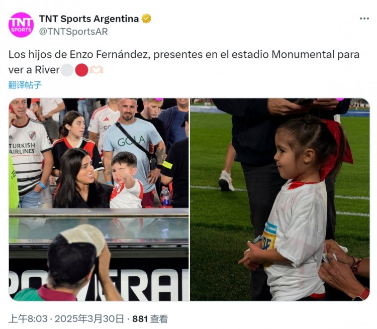 3月30日訊 河床對陣羅薩里奧中央的比賽正在進行中,恩佐-費爾南德斯的女友瓦倫蒂娜現(xiàn)場觀看比賽。瓦倫蒂娜帶著孩子們來到紀(jì)念碑球場,現(xiàn)場觀看河床隊的比賽。恩佐出身于河床青訓(xùn),他與瓦倫蒂娜去年曾分手,兩人今年1月份宣布復(fù)合。 本文標(biāo)簽: 足球 英超 切爾西 阿超