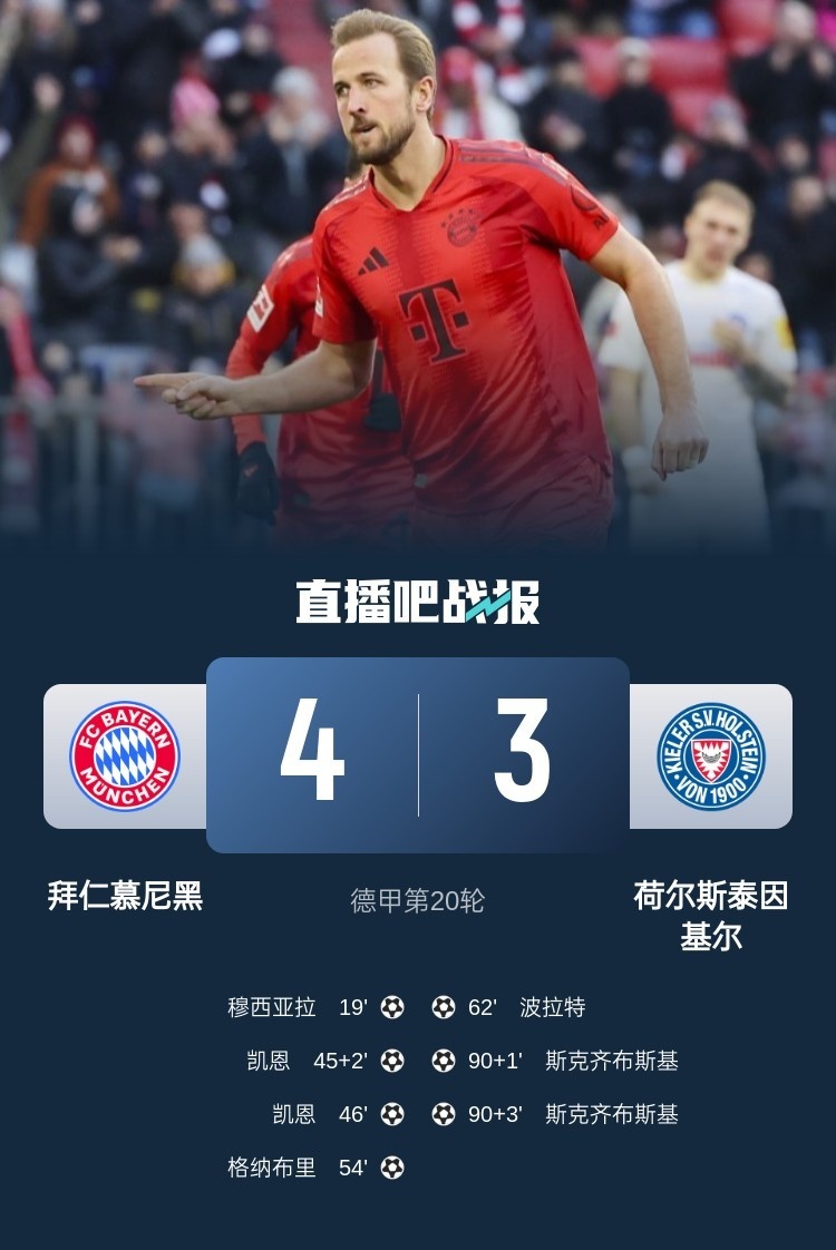 凱恩雙響,拜仁4-3力克基爾迎來德甲6連勝,多賽一場(chǎng)領(lǐng)先第二的勒沃庫森9分。