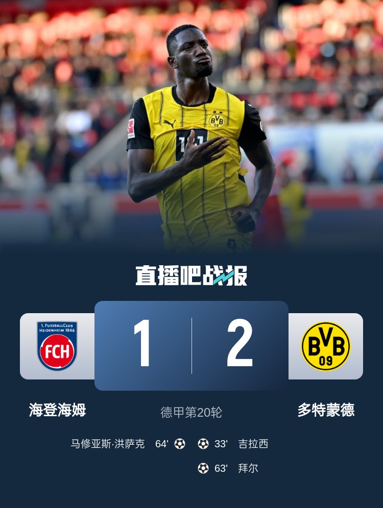 多特客場(chǎng)2-1擊敗海登海姆,結(jié)束4輪不勝。