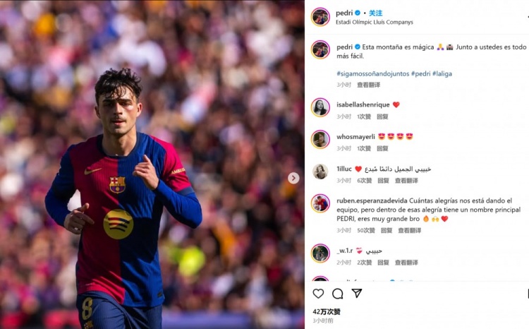 3月31日訊 巴薩在本輪西甲4-1大勝赫羅納,佩德里首發(fā)延續(xù)頂級表現(xiàn)。他也在賽后通過社媒曬出自己的比賽照,并感謝主場球迷:“這座山就像是有魔力一般?????????有你們的支持,一切都變得更容易了!”巴薩當前的臨時主場路易斯-孔帕尼斯奧林匹克體育場位于一座臺地之上,也因此被稱為山。 本文標簽: 足球 西甲 巴塞羅那 赫羅納