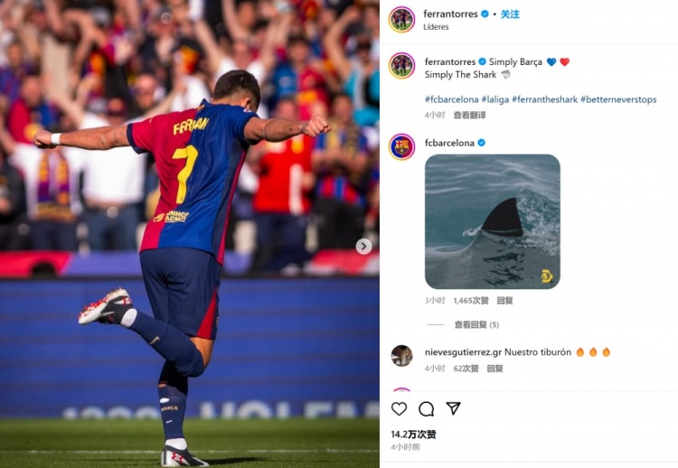 費(fèi)蘭-托雷斯也在賽后通過社媒曬出自己的慶祝照,并配文:“依然巴薩!依然鯊魚!”自信而貪婪的鯊魚精神也是費(fèi)蘭近年一直反復(fù)推崇強(qiáng)調(diào)的。