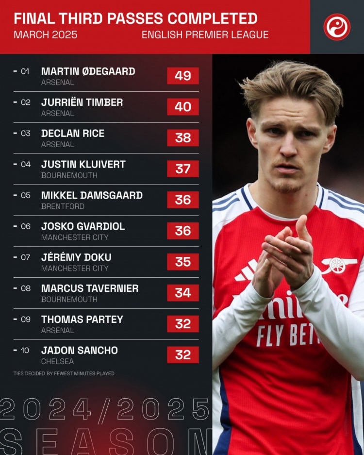 4月1日訊 Squawka統(tǒng)計了球員在3月份英超比賽中的進(jìn)攻三區(qū)成功傳球次數(shù),并列出榜單,阿森納包攬前三名。